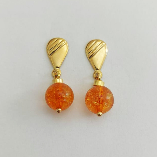 BRINCO FOLHEADO A OURO - BANHADO COM 5 MILÉSIMOS + VERNIZ DIAMOND - BRINCO PINO BASE DESENHADA PINGENTE PEDRA ÂMBAR 30MM - (OURO1024) OUBR000446