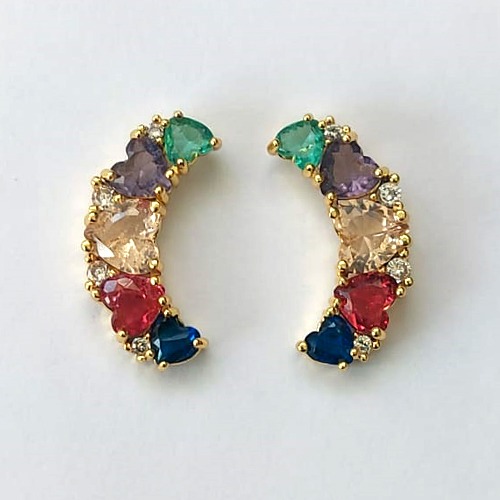 BRINCO FOLHEADO A OURO COM VERNIZ DIAMOND - BRINCO DE PINO MEIA LUA COM ZIRCÔNIAS COLORIDAS 21MM - (OURO811) OUBR000417