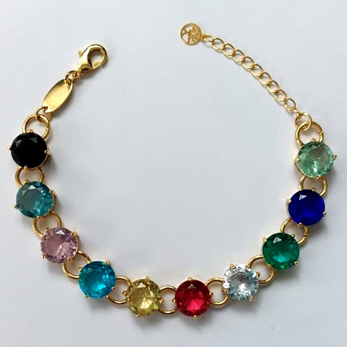 PULSEIRA FOLHEADA A OURO - BANHADO COM 5 MILÉSIMOS + VERNIZ DIAMOND - PULSEIRA COM BASE DE ALTA FUSÃO E ZIRCÔNIAS COLORIDAS 10MM - TAMANHO: 18CM - FECHO LAGOSTA (OURO670) OUPS000096